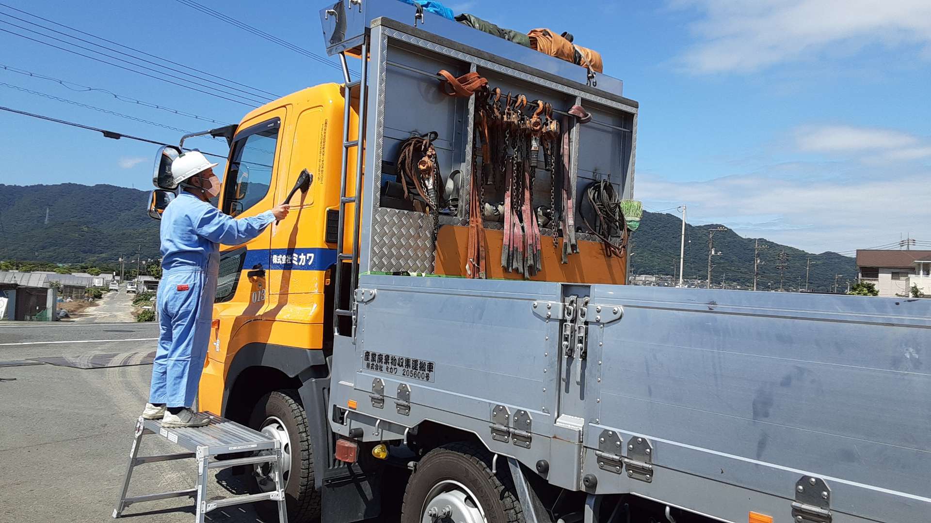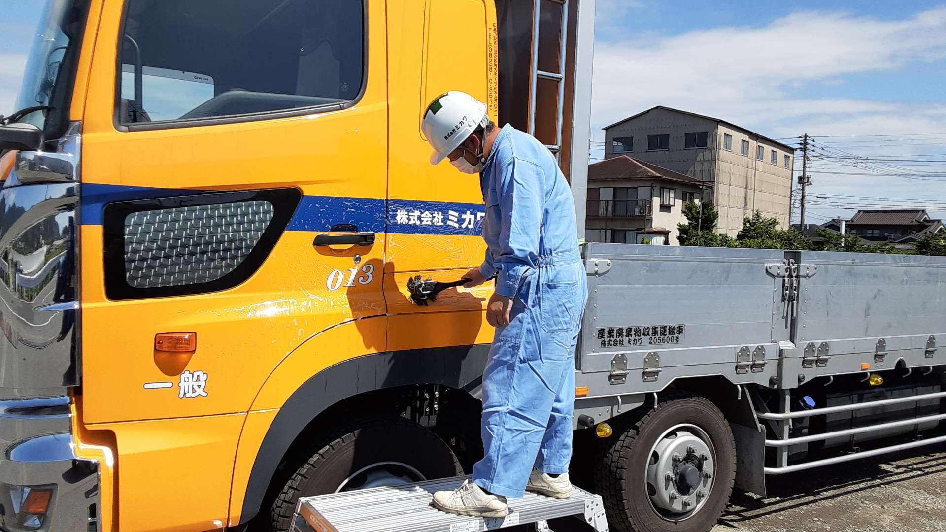 ドライバーさんが脚立を使って洗車をしている風景です!