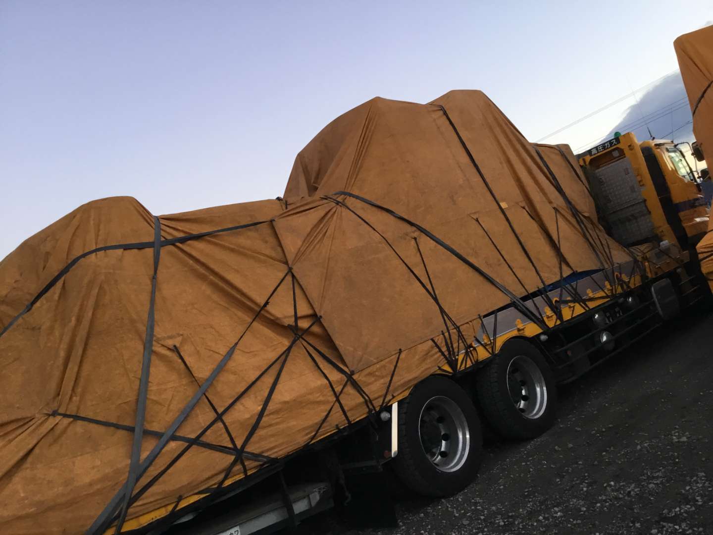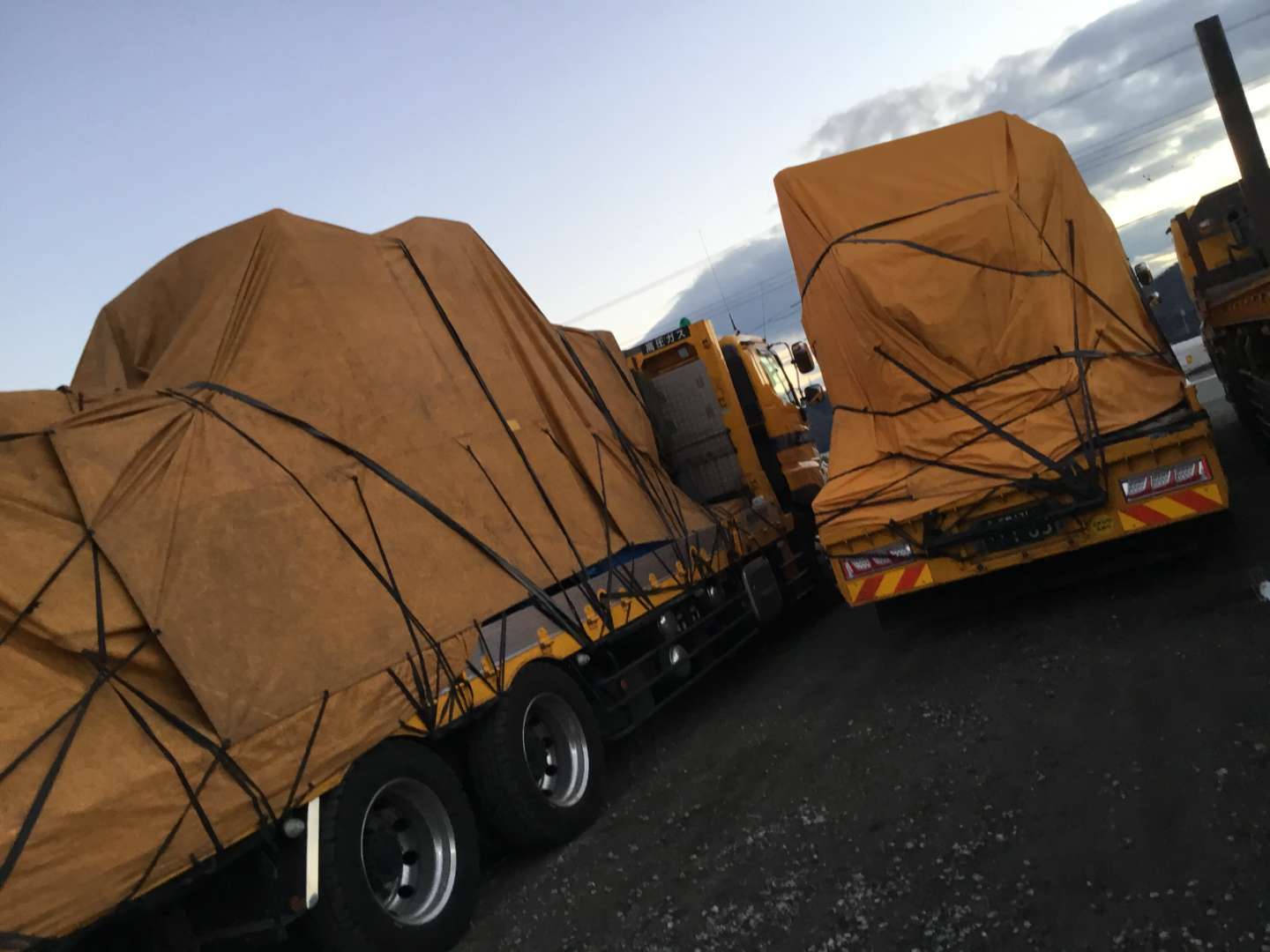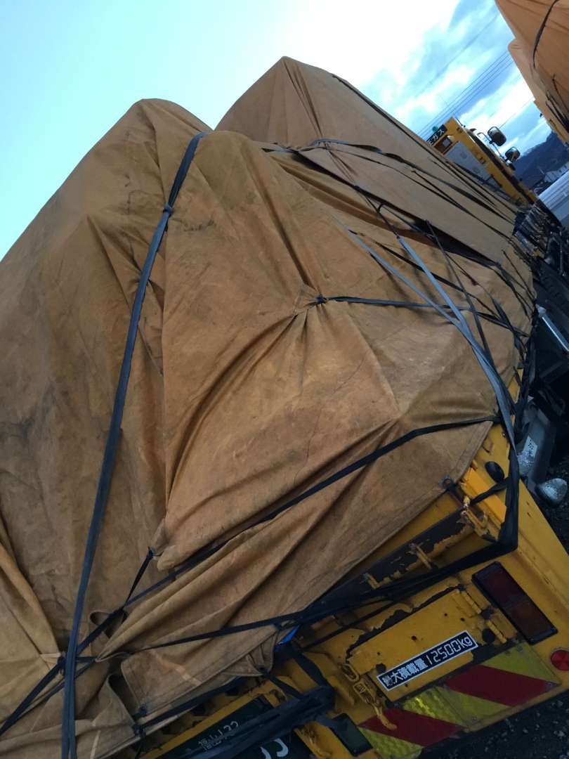 機械積込後シート掛けを車庫にいるドライバーさん達と協力しながら