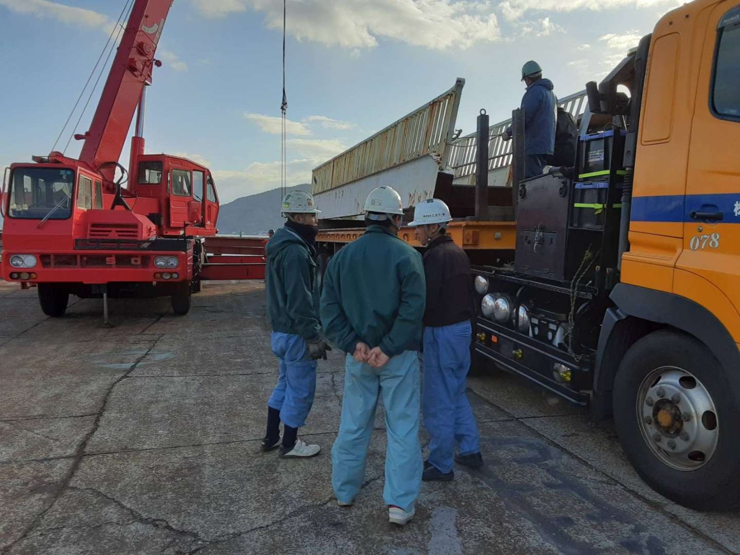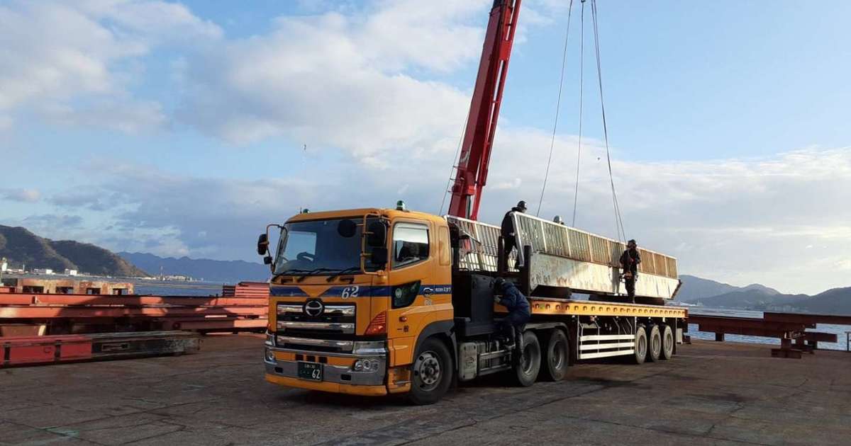 先日、広島県竹原市から広島県江田島市まで横断歩道橋の運搬業務を行いました。今回の車両は高床トレーラーです。